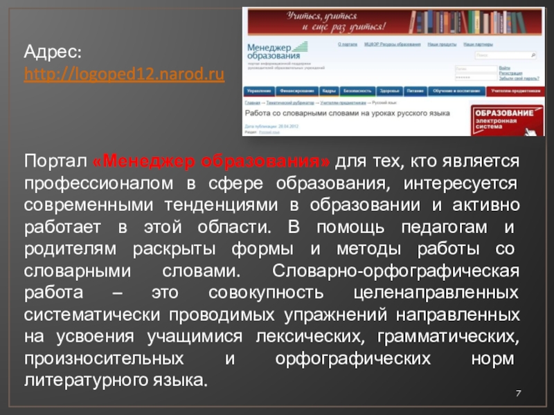 образования, интересуется современными тенденциями в образовании и активно работает в этой области. В помощь педагогам и родителям раскрыты формы и методы работы со словарными словами. Словарно-орфографическая работа – это совокупность целенаправленных систематически проводимых упражнений направленных на усвоения учащимися лексических, грамматических, произносительных и орфографических норм литературного языка.