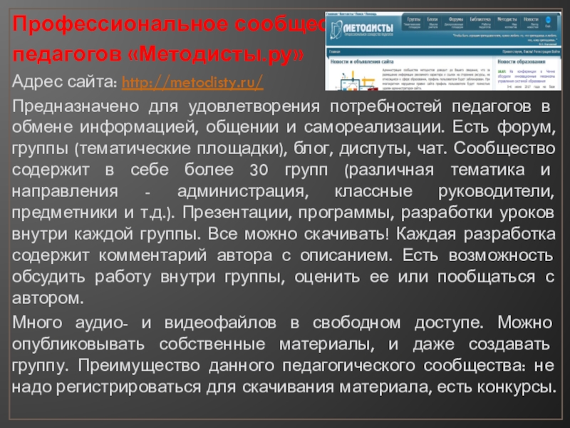 информацией, общении и самореализации. Есть форум, группы (тематические площадки), блог, диспуты, чат. Сообщество содержит в себе более 30 групп (различная тематика и направления - администрация, классные руководители, предметники и т.д.). Презентации, программы, разработки уроков внутри каждой группы. Все можно скачивать! Каждая разработка содержит комментарий автора с описанием. Есть возможность обсудить работу внутри группы, оценить ее или пообщаться с автором.