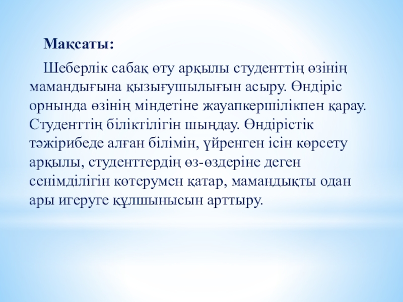 Мақсаты: Шеберлік сабақ өту арқылы студенттің өзінің мамандығына қызығушылығын асыру. Өндіріс орнында өзінің міндетіне жауапкершілікпен қарау. Студенттің