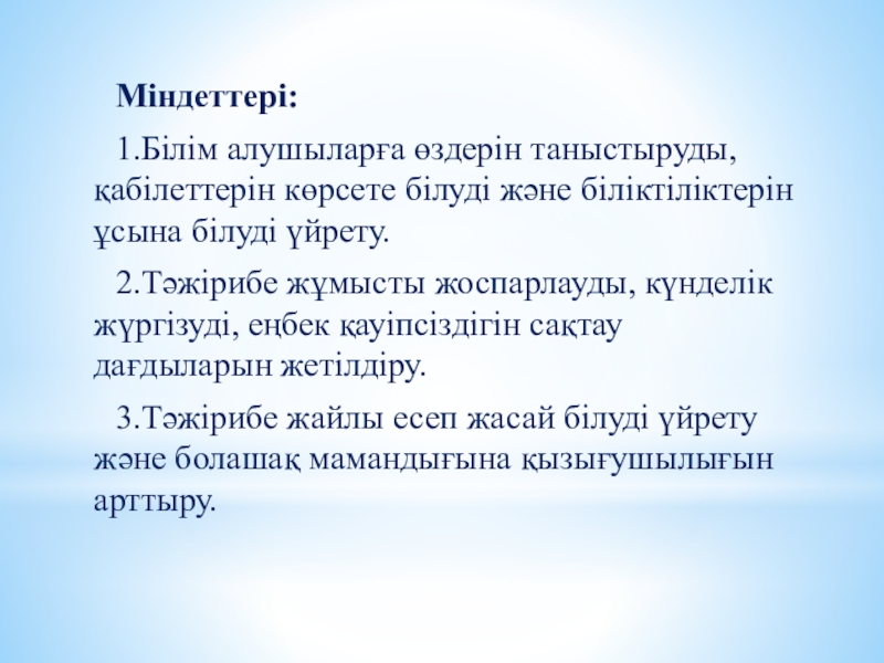 Міндеттері:1.Білім алушыларға өздерін таныстыруды, қабілеттерін көрсете білуді және біліктіліктерін ұсына білуді үйрету.2.Тәжірибе жұмысты жоспарлауды, күнделік жүргізуді, еңбек