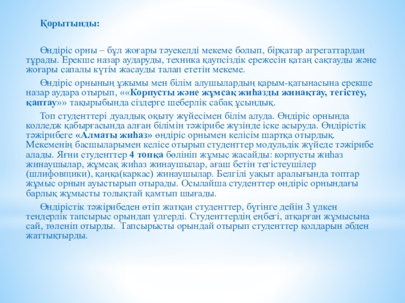 Өндірістік тәжірибеден өтіп жатқан студенттер, бүгінге дейін 3 үлкен тендерлік тапсырыс орындап үлгерді. Студенттердің еңбегі, атқарған жұмысына сай, төленіп отырды. Тапсырысты орындай отырып студенттер қолдарын әбден жаттықтырды.