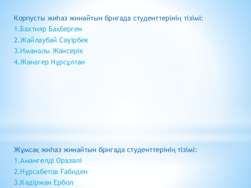 Слайд 4Корпусты жиһаз жинайтын бригада студенттерінің тізімі: