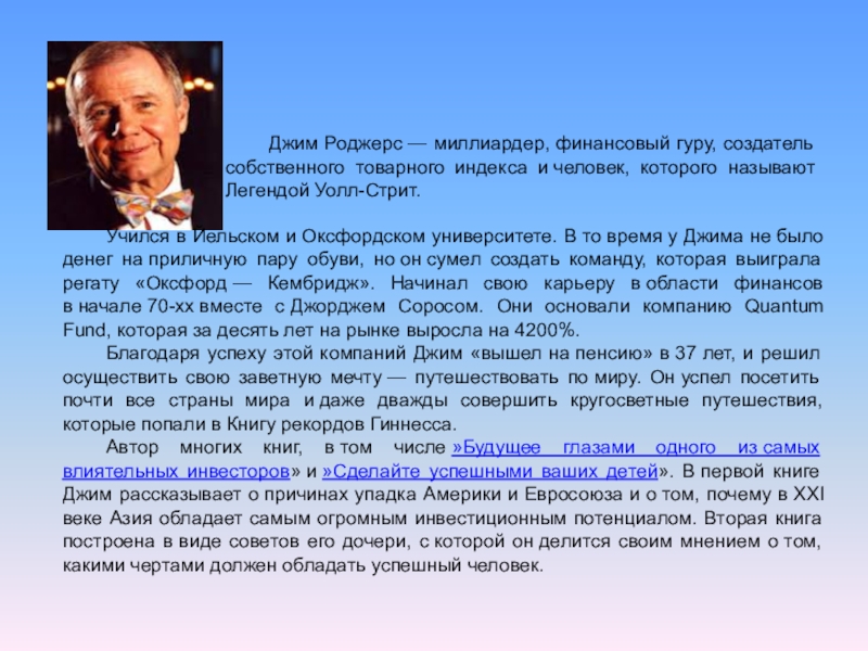 Джим Роджерс — миллиардер, финансовый гуру, создатель собственного товарного индекса и человек, которого называют Легендой Уолл-Стрит.
