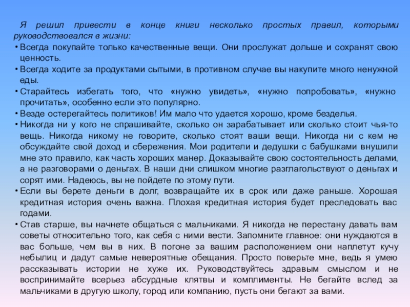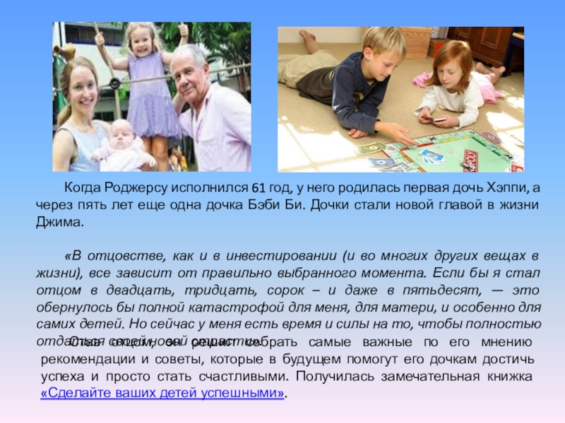 Став отцом, он решил собрать самые важные по его мнению рекомендации и советы, которые в будущем помогут его дочкам достичь успеха и просто стать счастливыми. Получилась замечательная книжка «Сделайте ваших детей успешными».
