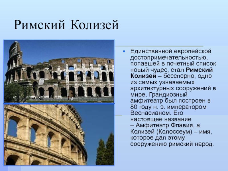 Слайд 74Единственной европейской достопримечательностью, попавшей в почетный список новый чудес, стал Римский