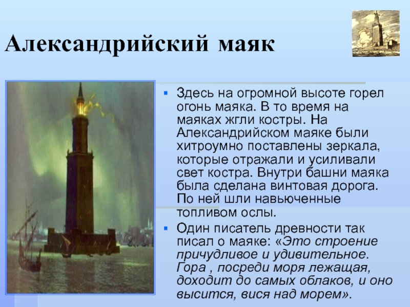 и не строили многоэтажных зданий. И всё же среди семи чудес света было одно сооружение, высота которого и в наше время считалась бы очень большой. Это был знаменитый Александрийский маяк (Фаросский), построенный на острове Фарос у берегов Египта более 2 тысяч лет назад. Столица Египта Александрия славилась своими учёными. Учёные сделали сложные математические и инженерные расчёты для проекта маяка. Расчёты их были так точны, что маяк простоял полторы тысячи лет.