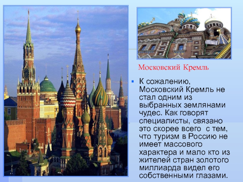 чудес. Как говорят специалисты, связано это скорее всего с тем, что туризм в Россию не имеет массового характера и мало кто из жителей стран золотого миллиарда видел его собственными глазами.