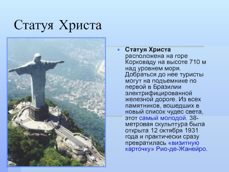 уровнем моря. Добраться до нее туристы могут на подъемнике по первой в Бразилии электрифицированной железной дороге. Из всех памятников, вошедших в новый список чудес света, этот самый молодой. 38-метровая скульптура была открыта 12 октября 1931 года и практически сразу превратилась «визитную карточку» Рио-де-Жанейро.
