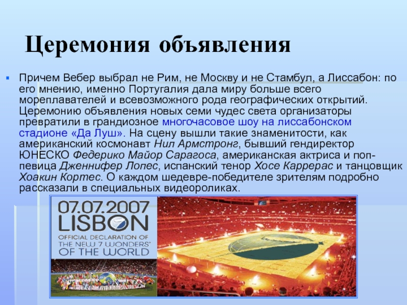 а Лиссабон: по его мнению, именно Португалия дала миру больше всего мореплавателей и всевозможного рода географических открытий. Церемонию объявления новых семи чудес света организаторы превратили в грандиозное многочасовое шоу на лиссабонском стадионе «Да Луш». На сцену вышли такие знаменитости, как американский космонавт Нил Армстронг, бывший гендиректор ЮНЕСКО Федерико Майор Сарагоса, американская актриса и поп-певица Дженнифер Лопес, испанский тенор Хосе Каррерас и танцовщик Хоакин Кортес. О каждом шедевре-победителе зрителям подробно рассказали в специальных видеороликах.