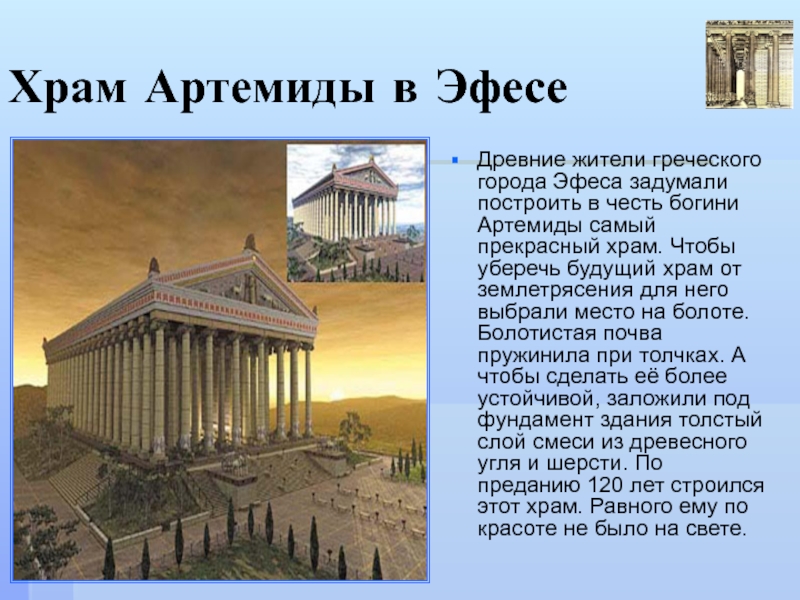 честь богини Артемиды самый прекрасный храм. Чтобы уберечь будущий храм от землетрясения для него выбрали место на болоте. Болотистая почва пружинила при толчках. А чтобы сделать её более устойчивой, заложили под фундамент здания толстый слой смеси из древесного угля и шерсти. По преданию 120 лет строился этот храм. Равного ему по красоте не было на свете.