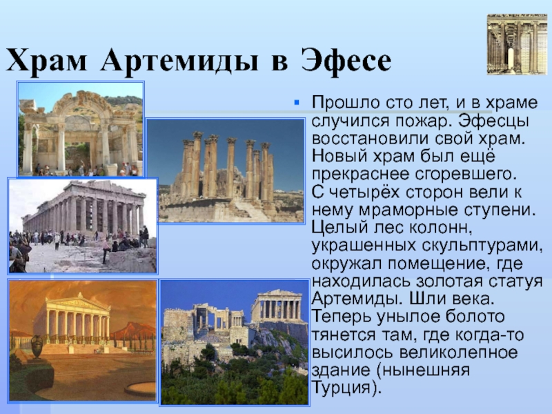 С четырёх сторон вели к нему мраморные ступени. Целый лес колонн, украшенных скульптурами, окружал помещение, где находилась золотая статуя Артемиды. Шли века. Теперь унылое болото тянется там, где когда-то высилось великолепное здание (нынешняя Турция).