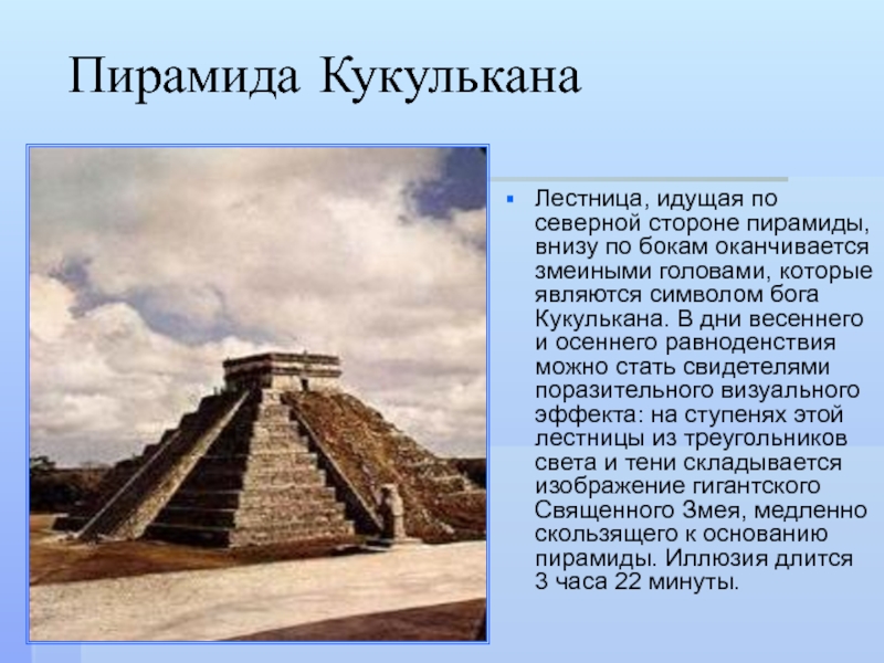 головами, которые являются символом бога Кукулькана. В дни весеннего и осеннего равноденствия можно стать свидетелями поразительного визуального эффекта: на ступенях этой лестницы из треугольников света и тени складывается изображение гигантского Священного Змея, медленно скользящего к основанию пирамиды. Иллюзия длится 3 часа 22 минуты.