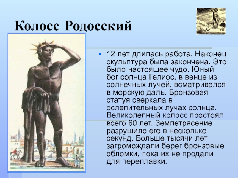 настоящее чудо. Юный бог солнца Гелиос, в венце из солнечных лучей, всматривался в морскую даль. Бронзовая статуя сверкала в ослепительных лучах солнца. Великолепный колосс простоял всего 60 лет. Землетрясение разрушило его в несколько секунд. Больше тысячи лет загромождали берег бронзовые обломки, пока их не продали для переплавки.