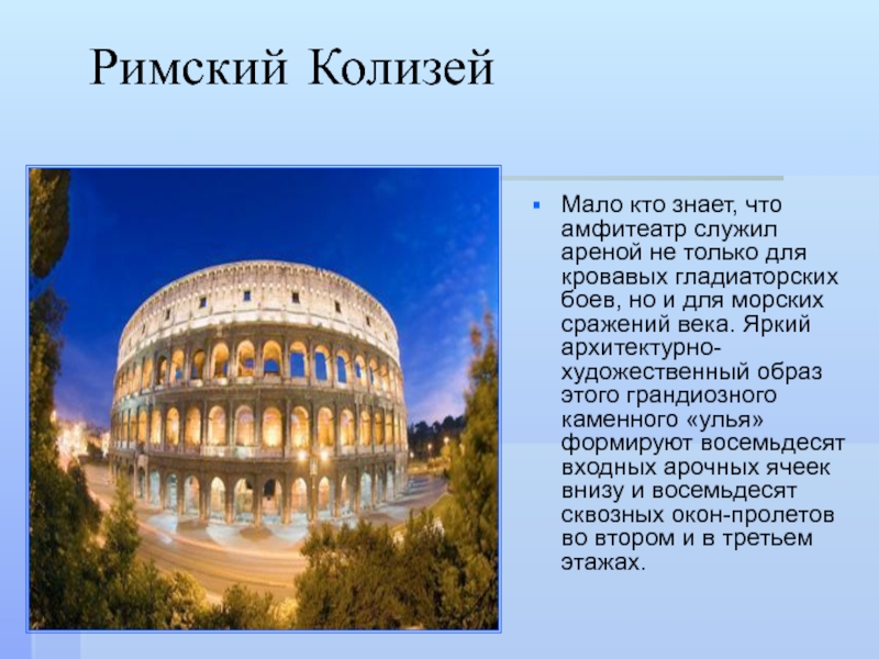 гладиаторских боев, но и для морских сражений века. Яркий архитектурно-художественный образ этого грандиозного каменного «улья» формируют восемьдесят входных арочных ячеек внизу и восемьдесят сквозных окон-пролетов во втором и в третьем этажах.