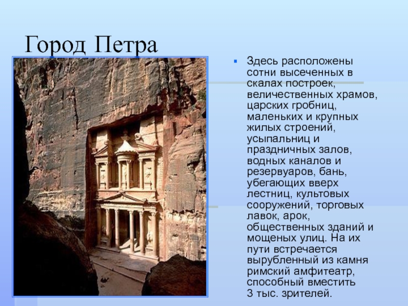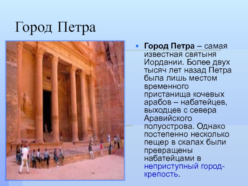 лет назад Петра была лишь местом временного пристанища кочевых арабов – набатейцев, выходцев с севера Аравийского полуострова. Однако постепенно несколько пещер в скалах были превращены набатейцами в неприступный город-крепость.