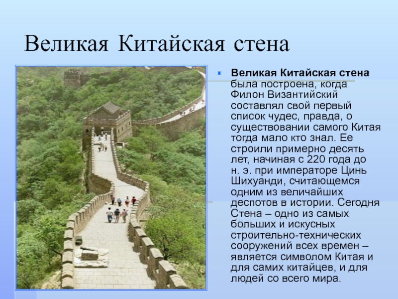 свой первый список чудес, правда, о существовании самого Китая тогда мало кто знал. Ее строили примерно десять лет, начиная с 220 года до н. э. при императоре Цинь Шихуанди, считающемся одним из величайших деспотов в истории. Сегодня Стена – одно из самых больших и искусных строительно-технических сооружений всех времен – является символом Китая и для самих китайцев, и для людей со всего мира.