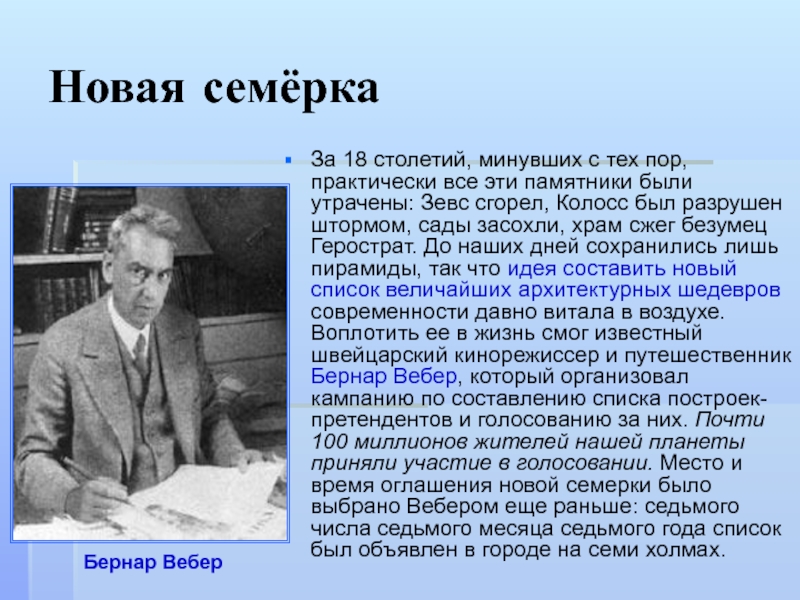 памятники были утрачены: Зевс сгорел, Колосс был разрушен штормом, сады засохли, храм сжег безумец Герострат. До наших дней сохранились лишь пирамиды, так что идея составить новый список величайших архитектурных шедевров современности давно витала в воздухе. Воплотить ее в жизнь смог известный швейцарский кинорежиссер и путешественник Бернар Вебер, который организовал кампанию по составлению списка построек-претендентов и голосованию за них. Почти 100 миллионов жителей нашей планеты приняли участие в голосовании. Место и время оглашения новой семерки было выбрано Вебером еще раньше: седьмого числа седьмого месяца седьмого года список был объявлен в городе на семи холмах.