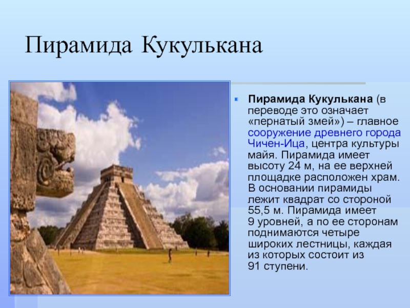 сооружение древнего города Чичен-Ица, центра культуры майя. Пирамида имеет высоту 24 м, на ее верхней площадке расположен храм. В основании пирамиды лежит квадрат со стороной 55,5 м. Пирамида имеет 9 уровней, а по ее сторонам поднимаются четыре широких лестницы, каждая из которых состоит из 91 ступени.