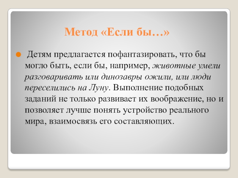 например, животные умели разговаривать или динозавры ожили, или люди переселились на Луну. Выполнение подобных заданий не только развивает их воображение, но и позволяет лучше понять устройство реального мира, взаимосвязь его составляющих.