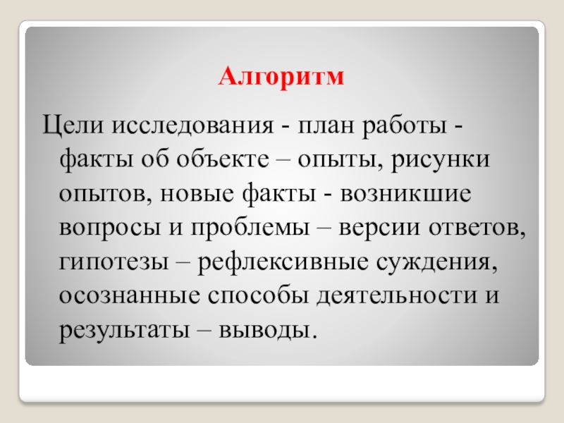 рисунки опытов, новые факты - возникшие вопросы и проблемы – версии ответов, гипотезы – рефлексивные суждения, осознанные способы деятельности и результаты – выводы.