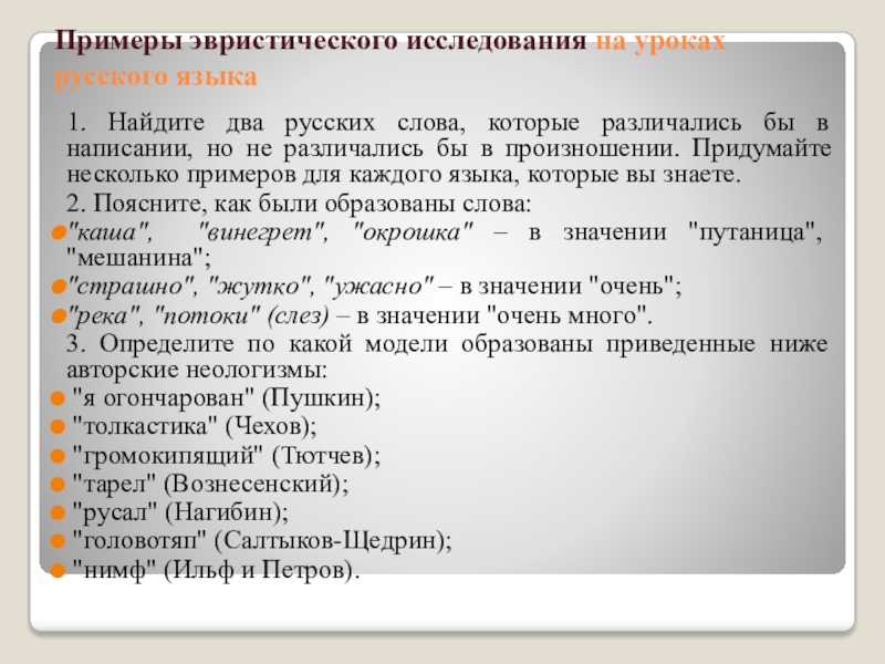 Слайд 15Примеры эвристического исследования на уроках русского языка