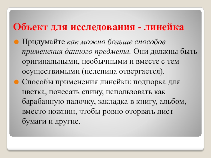 Способы применения линейки: подпорка для цветка, почесать спину, использовать как барабанную палочку, закладка в книгу, альбом, вместо ножниц, чтобы ровно оторвать лист бумаги и другие.