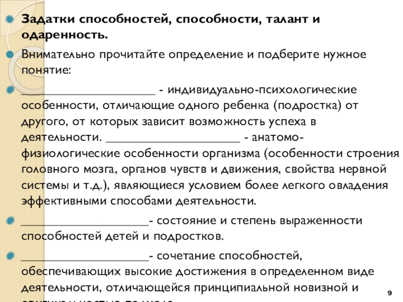 Слайд 9Задатки способностей, способности, талант и одаренность.