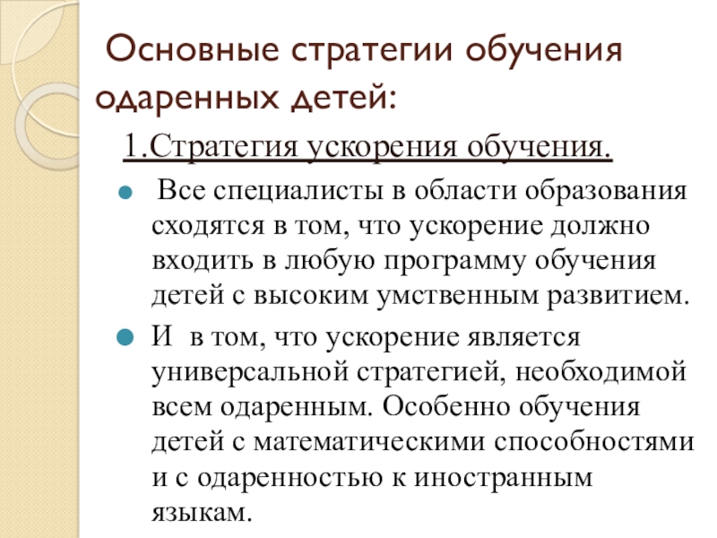 Слайд 14 Основные стратегии обучения одаренных детей: