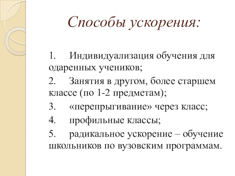 5. радикальное ускорение – обучение школьников по вузовским программам.