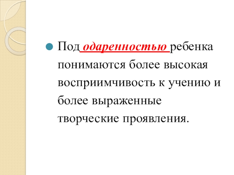 Слайд 8Под одаренностью ребенка понимаются более высокая восприимчивость к учению и более