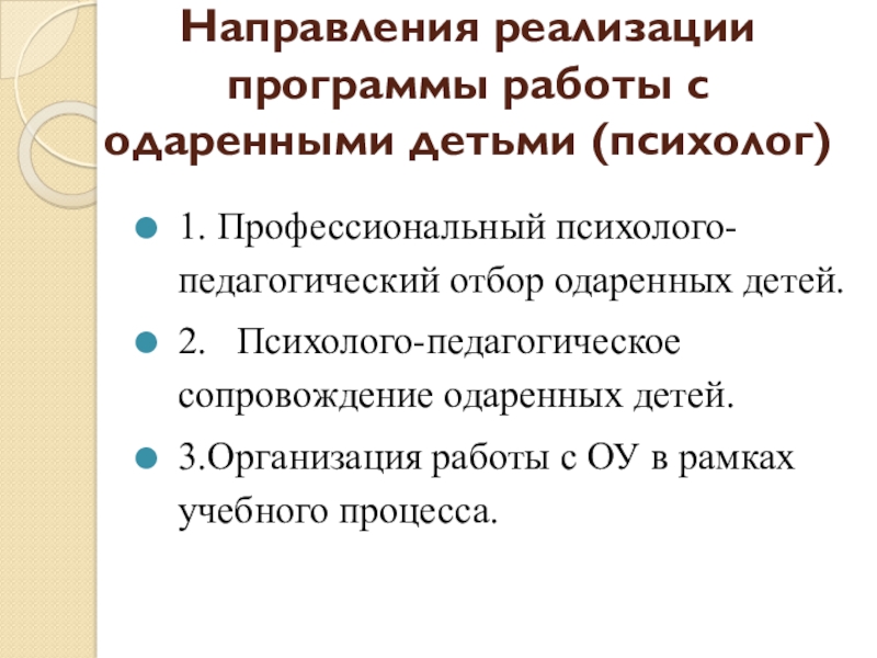 Слайд 25Направления реализации программы работы с одаренными детьми (психолог)