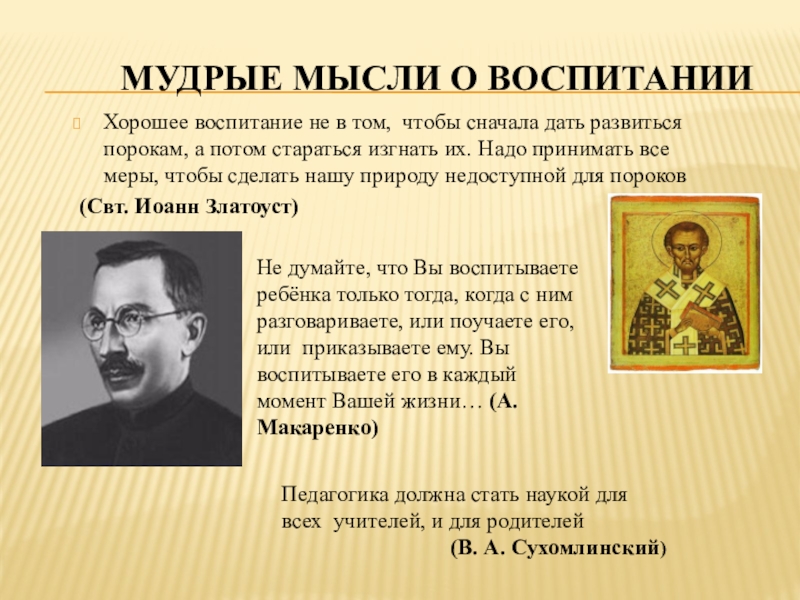 Не думайте, что Вы воспитываете ребёнка только тогда, когда с ним разговариваете, или поучаете его, или приказываете ему. Вы воспитываете его в каждый момент Вашей жизни… (А. Макаренко)
