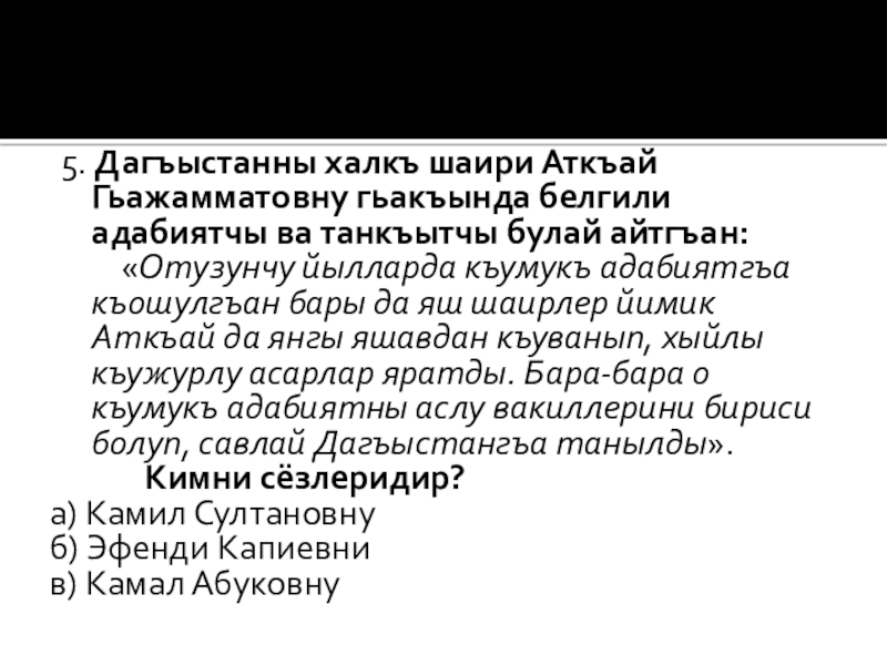 5. Дагъыстанны халкъ шаири Аткъай Гьажамматовну гьакъында белгили адабиятчы ва танкъытчы булай айтгъан:
