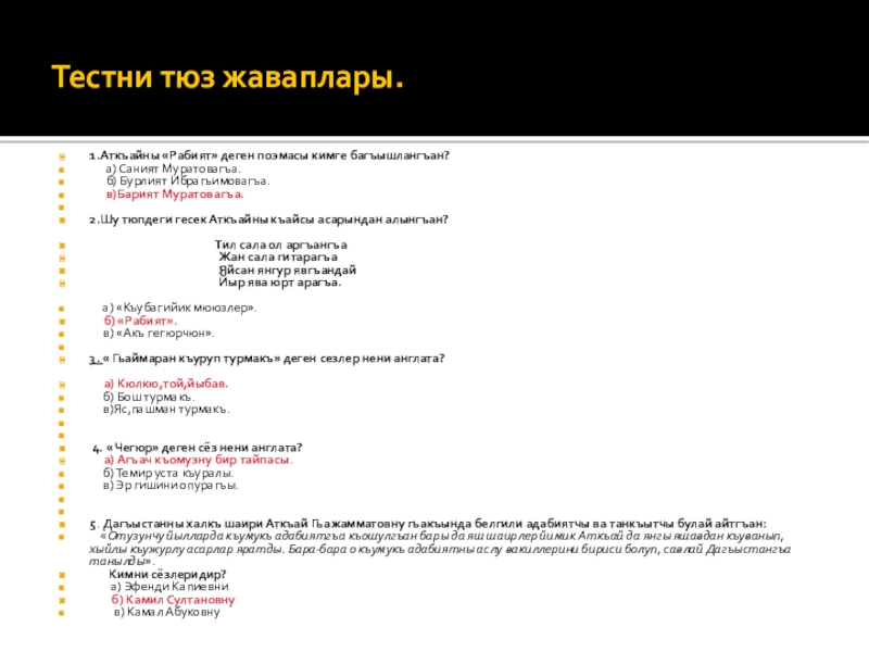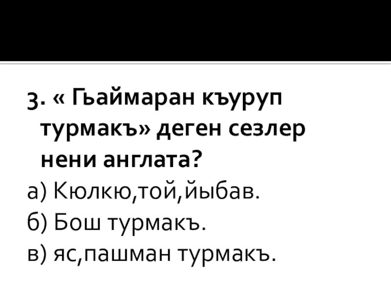 Слайд 63. « Гьаймаран къуруп турмакъ» деген сезлер нени англата?