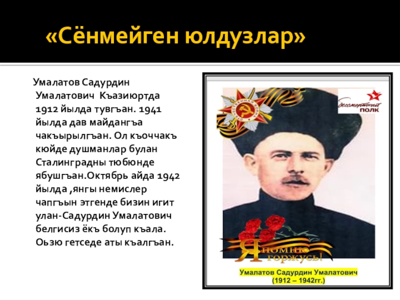 тувгъан. 1941 йылда дав майдангъа чакъырылгъан. Ол къоччакъ кюйде душманлар булан Сталинградны тюбюнде ябушгъан.Октябрь айда 1942 йылда ,янгы немислер чапгъын этгенде бизин игит улан-Садурдин Умалатович белгисиз ёкъ болуп къала.Оьзю гетседе аты къалгъан.