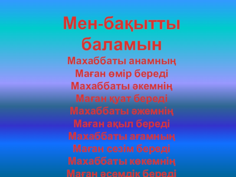 Мен-бақытты баламынМахаббаты анамныңМаған өмір бередіМахаббаты әкемнің Маған қуат бередіМахаббаты әжемніңМаған ақыл бередіМахаббаты ағамныңМаған сезім бередіМахаббаты көкемнің Маған әсемдік береді