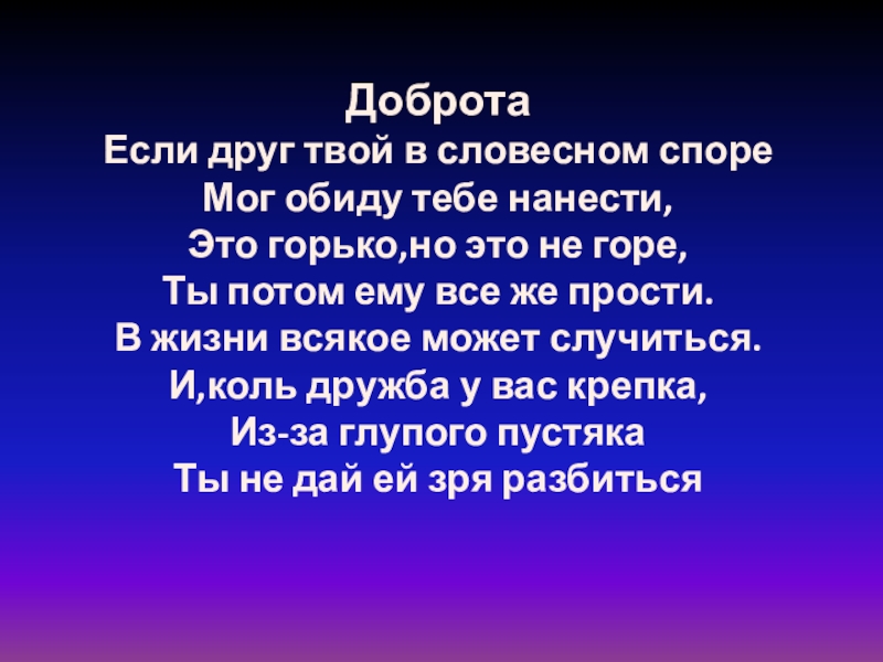 ДобротаЕсли друг твой в словесном спореМог обиду тебе нанести,Это горько,но это не горе,Ты потом ему все же