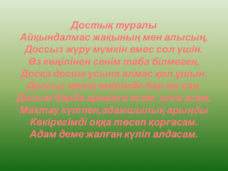 Достық туралыАйқындалмас жақының мен алысың,Доссыз жүру мүмкін емес сол үшін.Өз көңілінен сенім таба білмеген,Досқа досша ұсына алмас