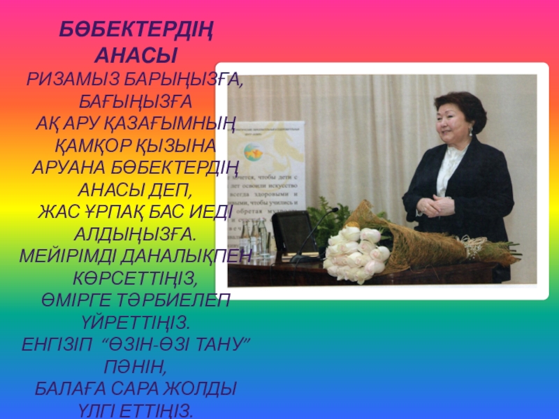 Бөбектердің анасыризамыз барыңызға,бағыңызғаАқ ару қазағымның қамқор қызынаАруана бөбектердің анасы деп,Жас ұрпақ бас иеді алдыңызға.Мейірімді даналықпен көрсеттіңіз,Өмірге тәрбиелеп