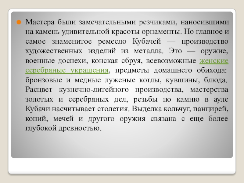 Мастера были замечательными резчиками, наносившими на камень удивительной красоты орнаменты. Но главное и самое знаменитое ремесло Кубачей