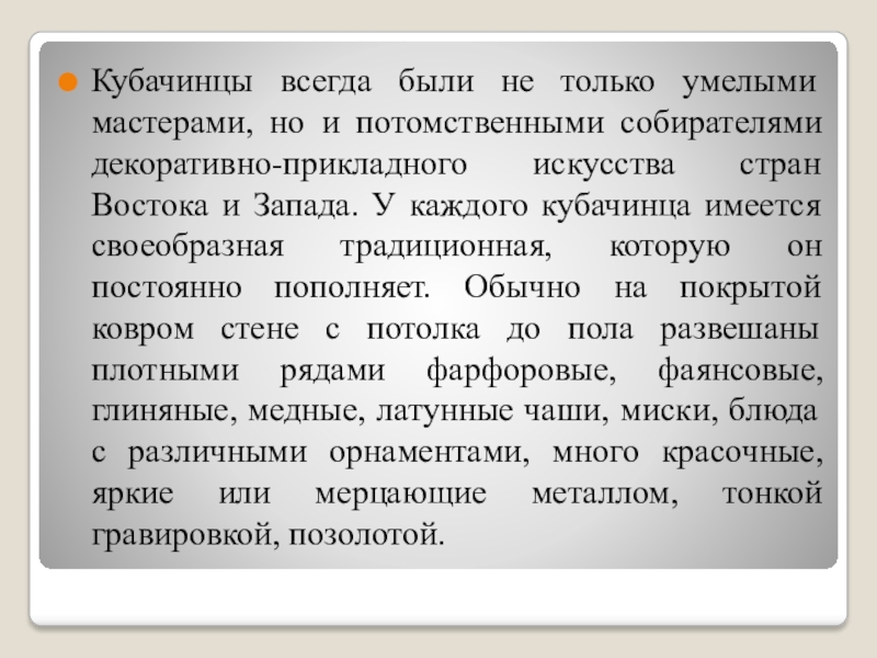 декоративно-прикладного искусства стран Востока и Запада. У каждого кубачинца имеется своеобразная традиционная, которую он постоянно пополняет. Обычно на покрытой ковром стене с потолка до пола развешаны плотными рядами фарфоровые, фаянсовые, глиняные, медные, латунные чаши, миски, блюда с различными орнаментами, много красочные, яркие или мерцающие металлом, тонкой гравировкой, позолотой.