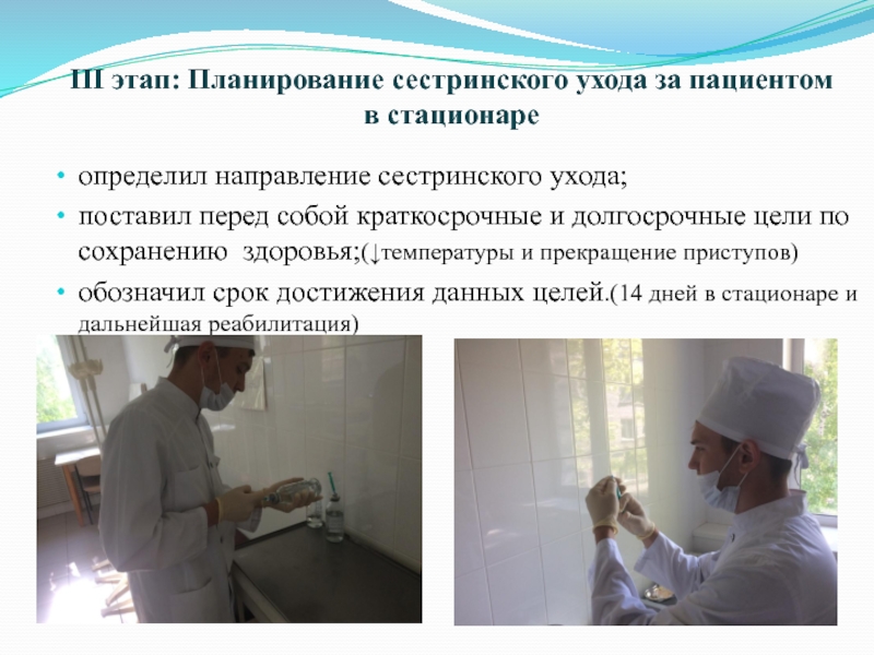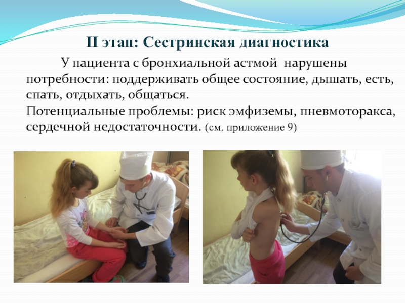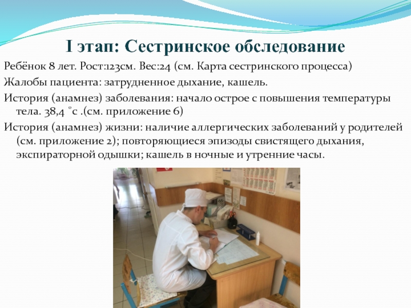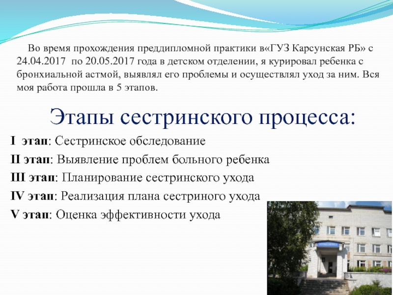 Во время прохождения преддипломной практики в«ГУЗ Карсунская РБ» с 24.04.2017 по 20.05.2017 года в детском отделении, я курировал ребенка с бронхиальной астмой, выявлял его проблемы и осуществлял уход за ним. Вся моя работа прошла в 5 этапов.