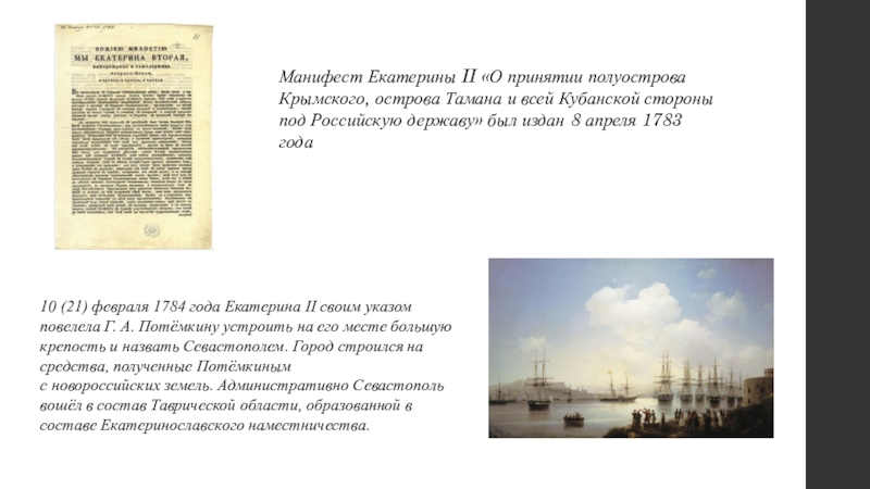 10 (21) февраля 1784 года Екатерина II своим указом повелела Г. А. Потёмкину устроить на его месте большую крепость и назвать Севастополем. Город строился на средства, полученные Потёмкиным с новороссийских земель. Административно Севастополь вошёл в состав Таврической области, образованной в составе Екатеринославского наместничества.