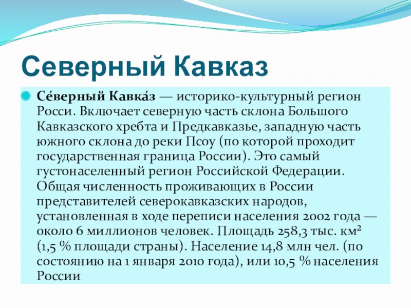 Северный КавказСе́верный Кавка́з — историко-культурный регион Росси. Включает северную часть склона Большого Кавказского хребта и Предкавказье, западную часть южного склона до реки Псоу (по которой проходит государственная граница России). Это самый густонаселенный регион Российской Федерации. Общая численность