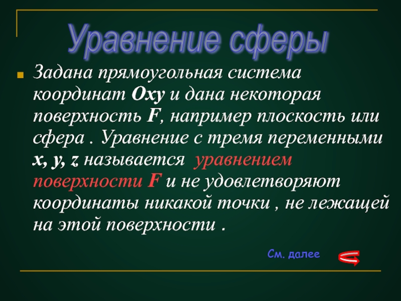 плоскость или сфера . Уравнение с тремя переменными x, у, z называется уравнением поверхности F и не удовлетворяют координаты никакой точки , не лежащей на этой поверхности .