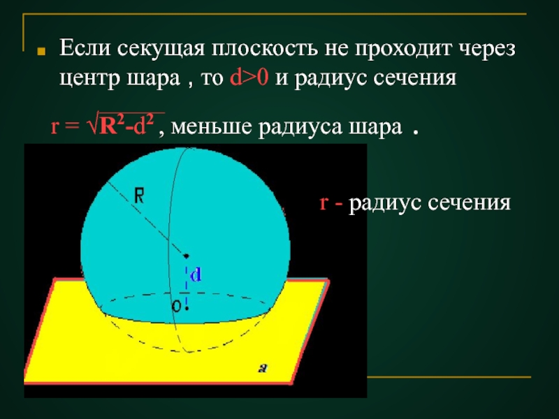 Слайд 27Если секущая плоскость не проходит через центр шара , то d>0