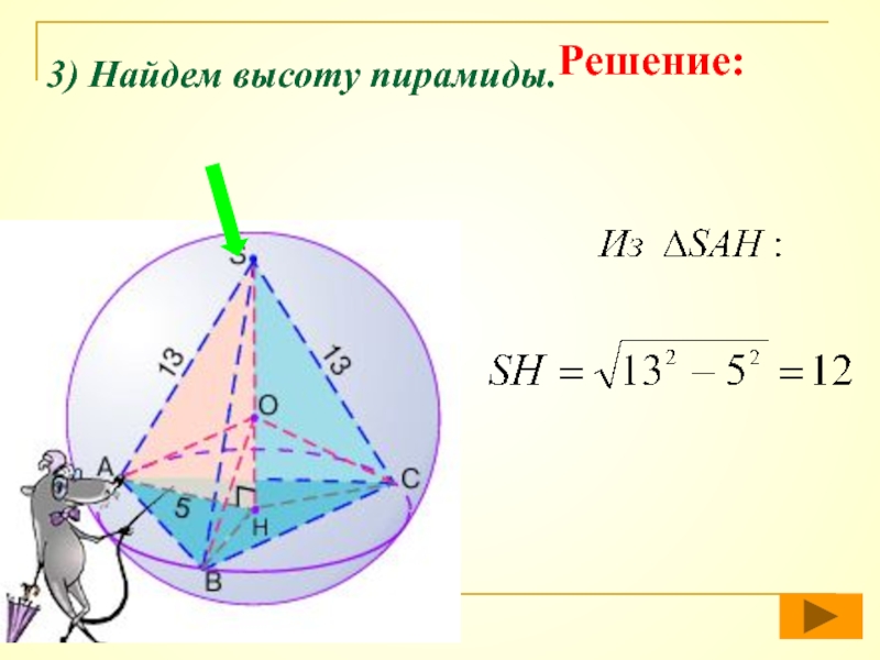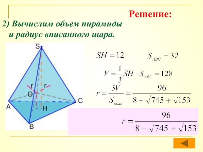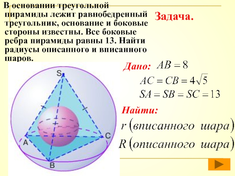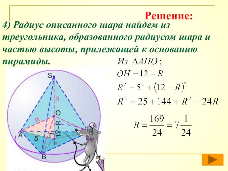 Слайд 484) Радиус описанного шара найдем из треугольника, образованного радиусом шара и