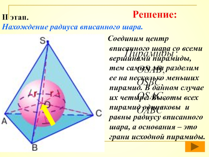 Слайд 49 Соединим центр вписанного шара со всеми вершинами пирамиды, тем