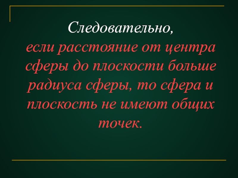 Слайд 25Итак, если расстояние от центра сферы до плоскости меньше радиуса сферы,