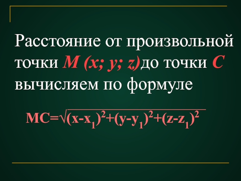 Слайд 17Расстояние от произвольной точки M (x; y; z)до точки С вычисляем